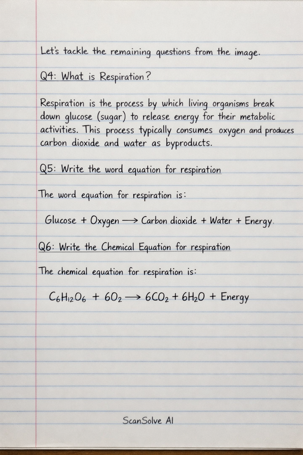 Q4: What is Respiration? Respiration is the process by which living organisms break down glucose (sugar) to release energy for their metabolic activities. This process typically consumes oxygen and produces carbon dioxide and water as byproducts.