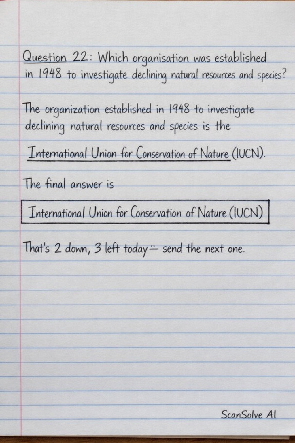 Question 22: Which organisation was established in 1948 to investigate declining natural resources and species?