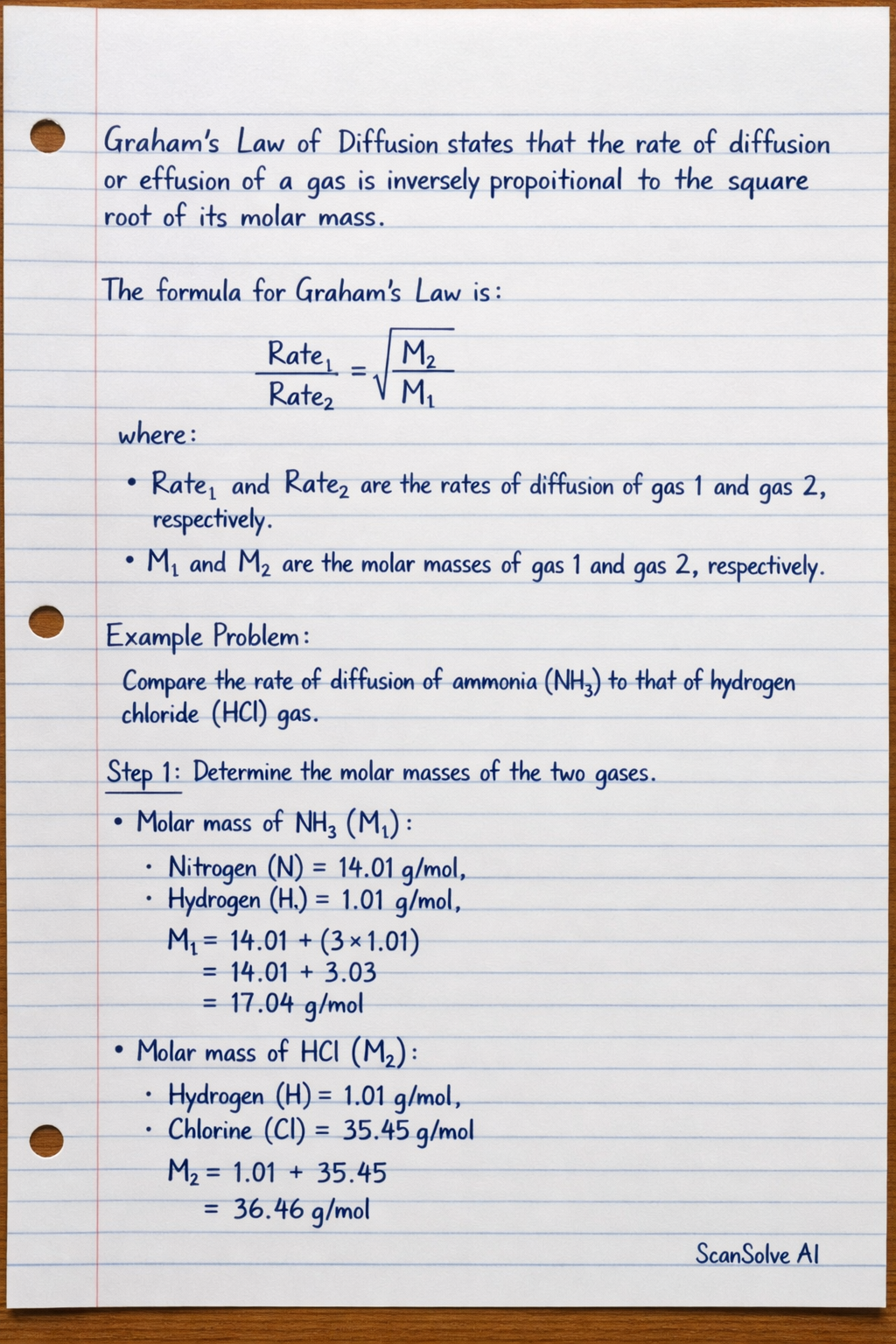 Step 1: Determine the molar masses of the two gases. • Molar mass of (): Nitrogen (N) = Hydrogen (H) =