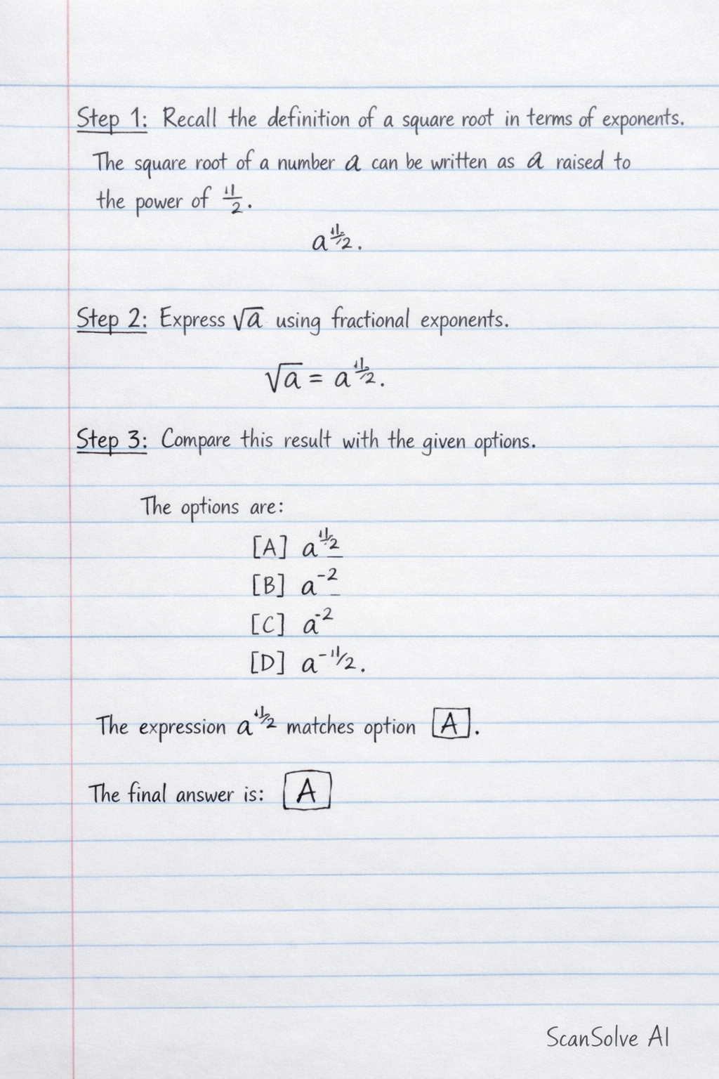Step 1: Recall the definition of a square root in terms of exponents. The square root of a number can be written as raised to the power of .