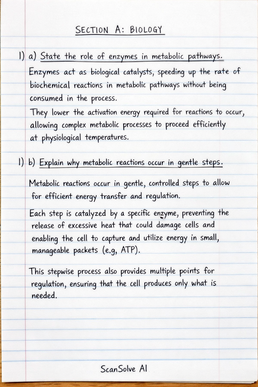 1) b) Explain why metabolic reactions occur in gentle steps.