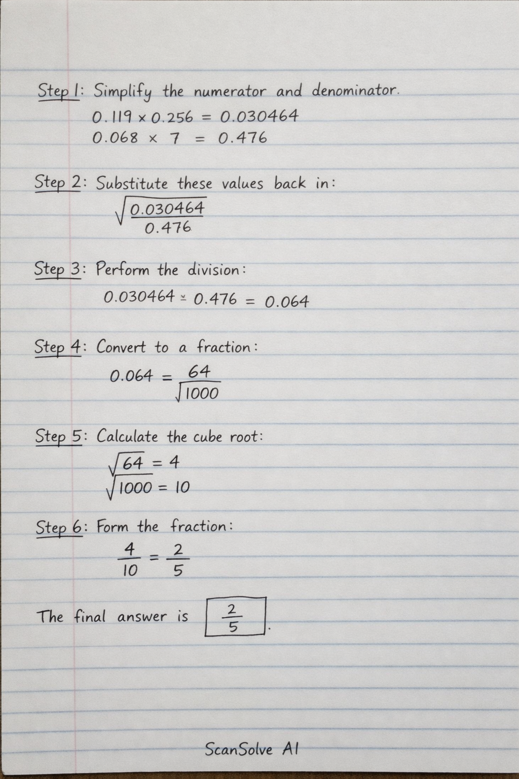 Step 4: Find the cube root of the resulting decimal. Convert the decimal to a fraction to find its cube root without a calculator. So the expression becomes:
