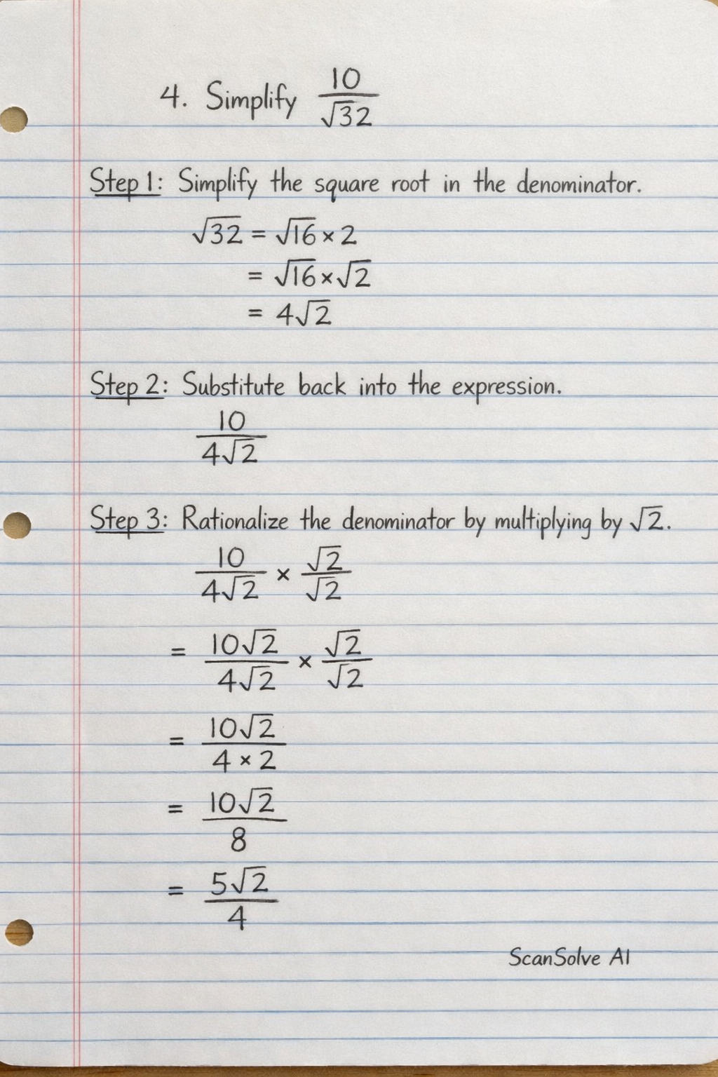 4. Simplify Step 1: Simplify the square root in the denominator. Step 2: Substitute the simplified square root back into the expression. Step 3: Rationalize the denominator by multiplying the numerator and denominator by .