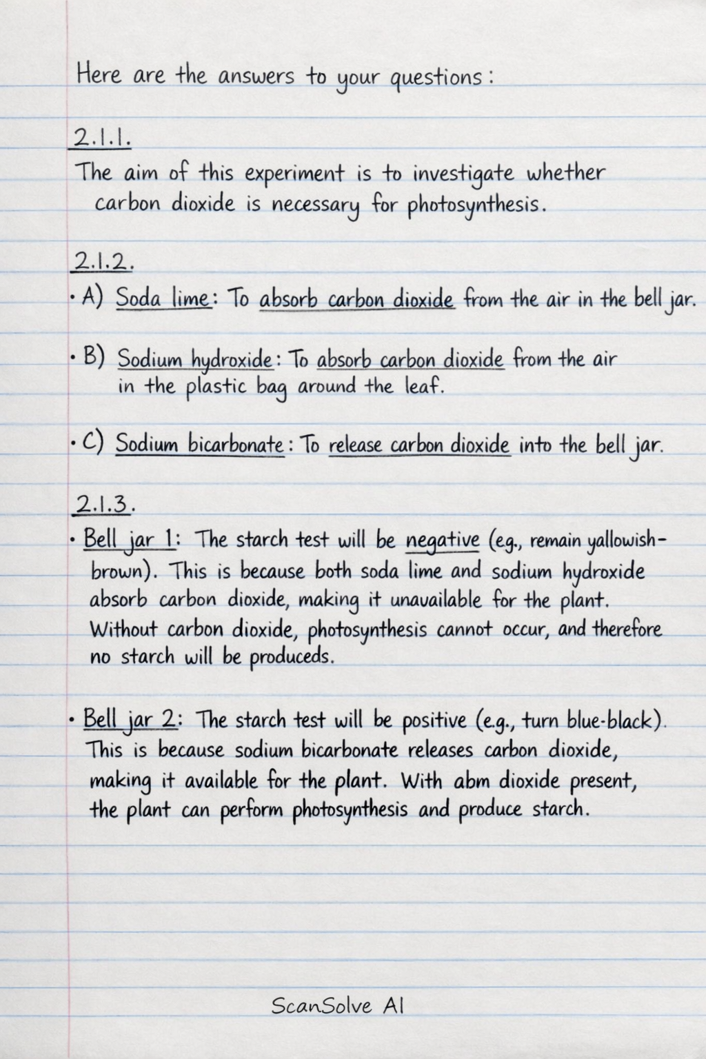 2.1.1 The aim of this experiment is to investigate whether carbon dioxide is necessary for photosynthesis.