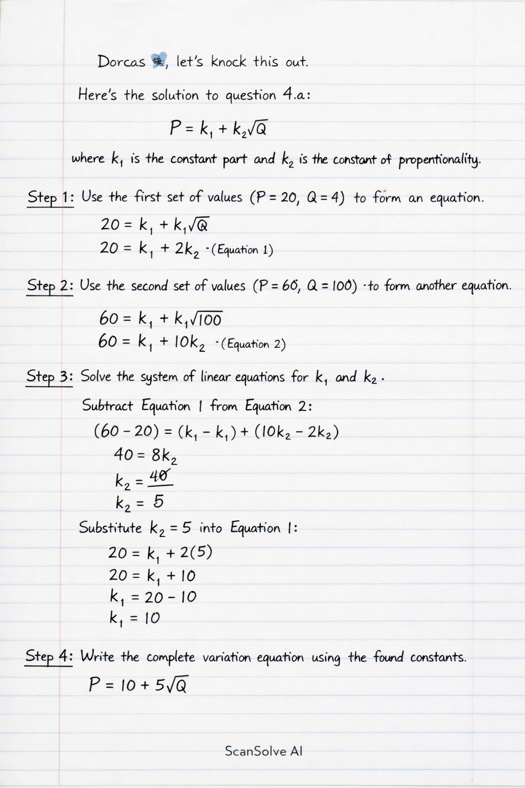 🌸Dorcas🦋, let's knock this out. Here's the solution to question 4.a: The problem states that quantity P is partly constant and partly varies as the square root of Q.
