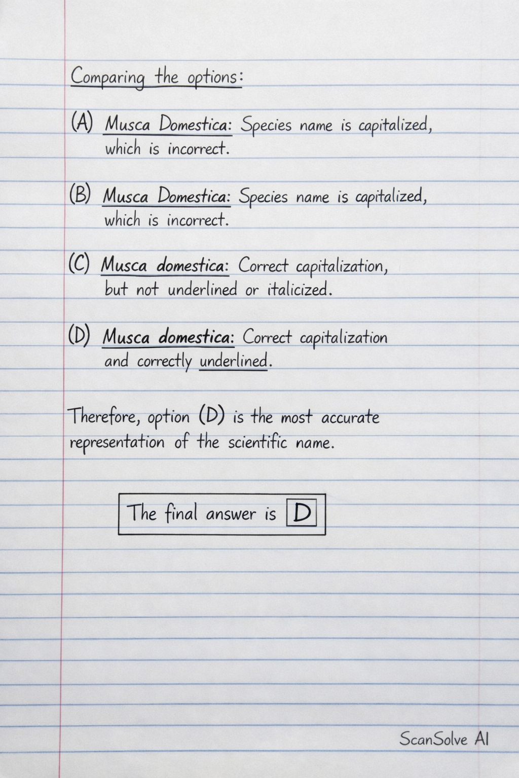 The scientific name of the housefly is Musca domestica. According to the rules of binomial nomenclature, the genus name (Musca) should be capitalized, and the species name (domestica) should be lowe