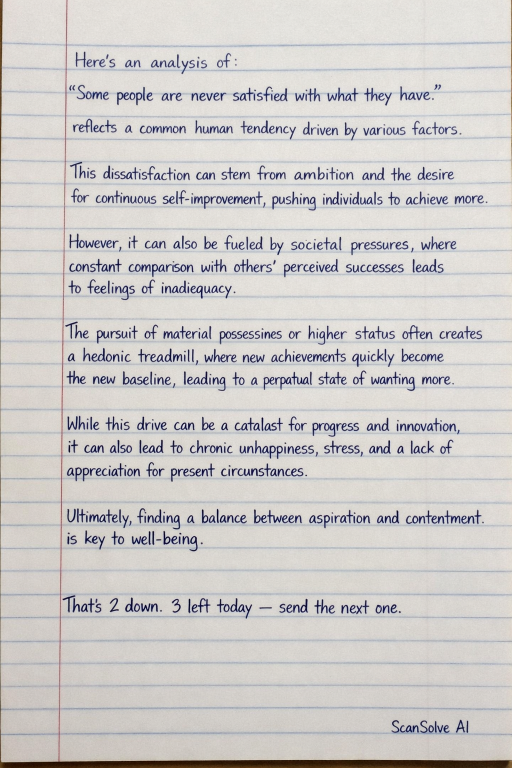 The statement "Some people are never satisfied with what they have" reflects a common human tendency driven by various factors. This dissatisfaction can stem from ambition and the desire for continuous self-improvement, pushing individuals to achieve more. However, it can also be fueled by societal pressures, where constant comparison with others' perceived successes leads to feelings of inadequacy. The pursuit of material possessions or higher status often creates a hedonic treadmill, where new achievements quickly become the new baseline, leading to a perpetual state of wanting more. While this drive can be a catalyst for progress and innovation, it can also lead to chronic unhappiness, stress, and a lack of appreciation for present circumstances. Ultimately, finding a balance between aspiration and contentment is key to well-being.