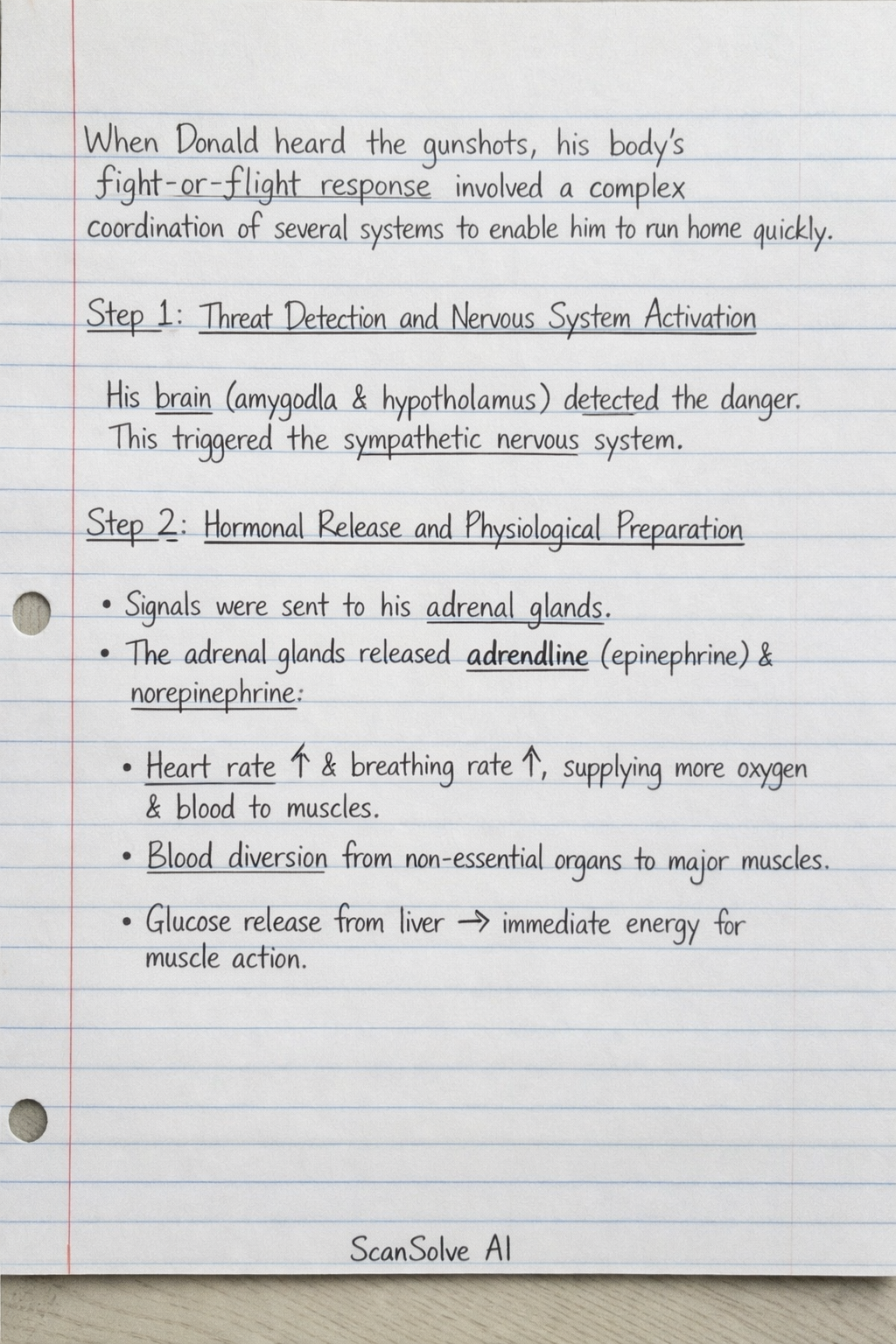 When Donald heard the gunshots, his body's fight-or-flight response involved a complex coordination of several systems to enable him to run home quickly.