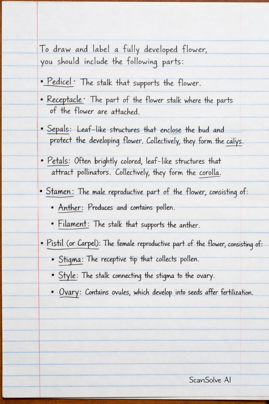 A diagram would show these parts arranged concentrically, with the sepals and petals forming the outer whorls, and the stamens and pistil forming the inner reproductive structures.