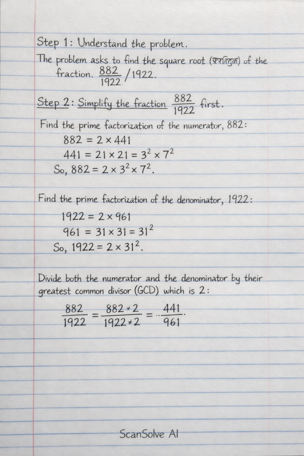 to find the square root (वर्गमूल) of the fraction (882)/(1922).