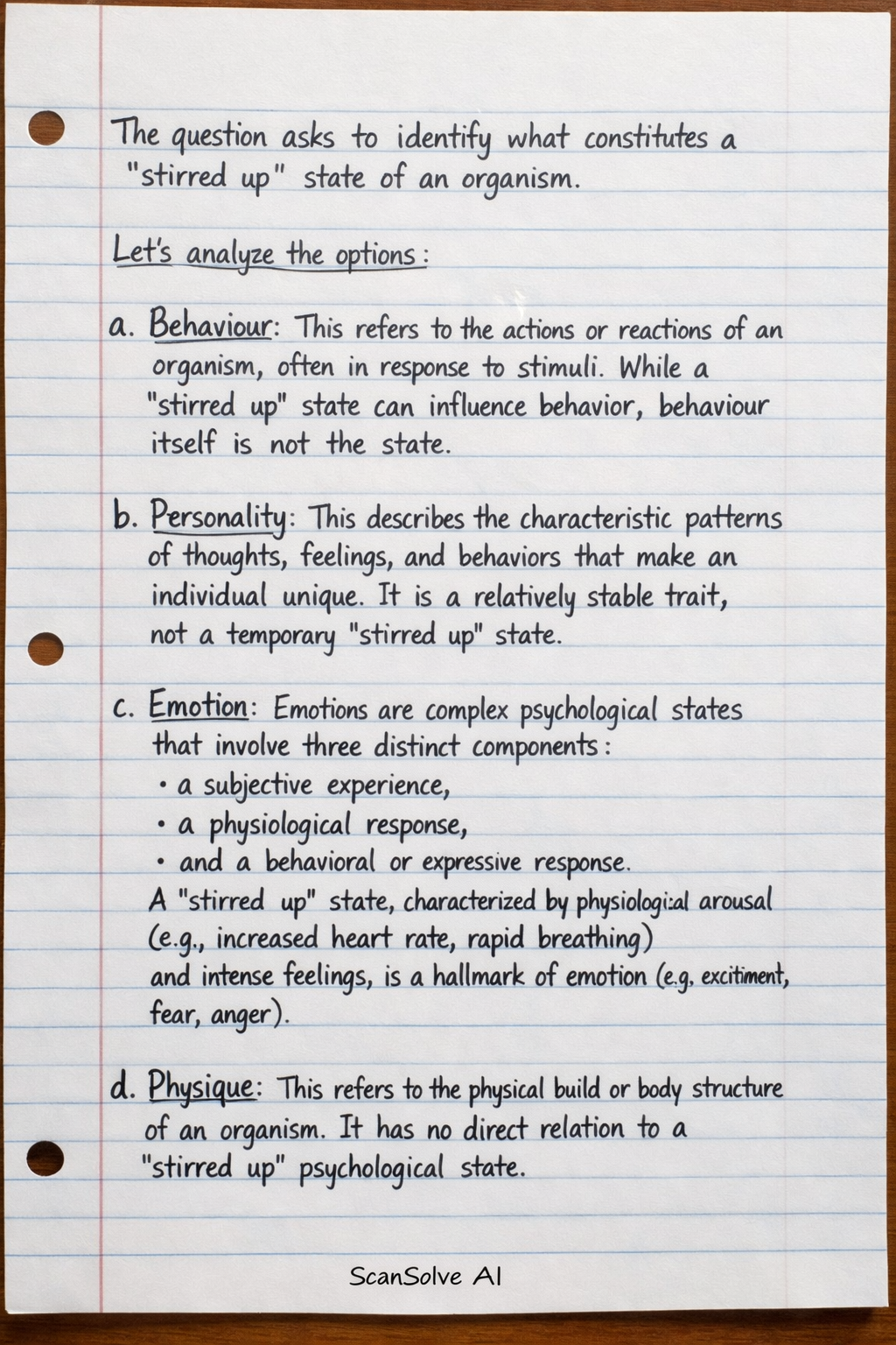 d. Physique: This refers to the physical build or body structure of an organism. It has no direct relation to a "stirred up" psychological state.