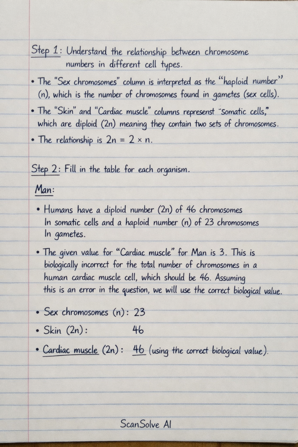 - The given value for "Cardiac muscle" for Man is 3. This is biologically incorrect for the total number of chromosomes in a human cardiac muscle cell, which should be 46. Assuming this is an error in the question, we will use the correct biological value.