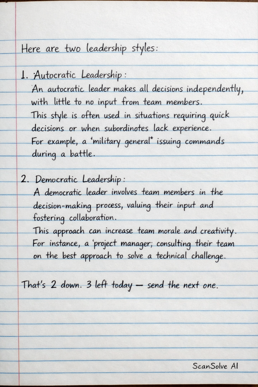 1. Autocratic Leadership: An autocratic leader makes all decisions independently, with little to no input from team members. This style is often used in situations requiring quick decisions or when