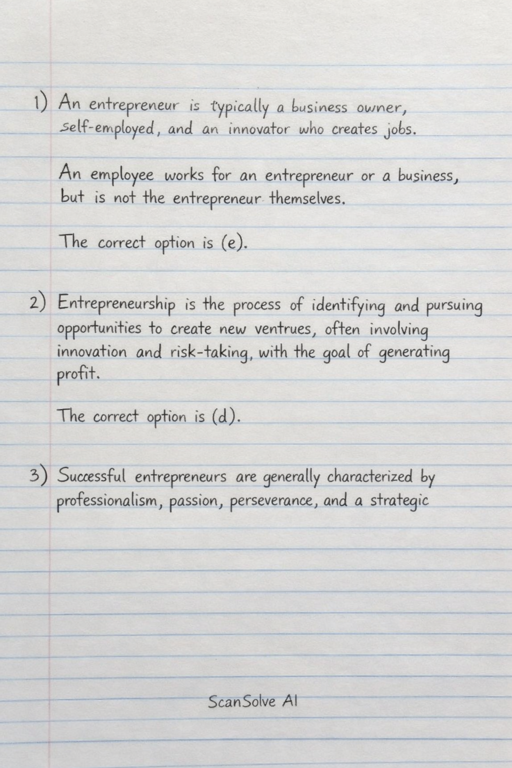 1) The following notions can be used interchangeably with entrepreneur, except: An entrepreneur is typically a business owner, self-employed, and an innovator who creates jobs. An employee works for an entrepreneur or a business, but is not the entrepreneur themselves. The correct option is (e).