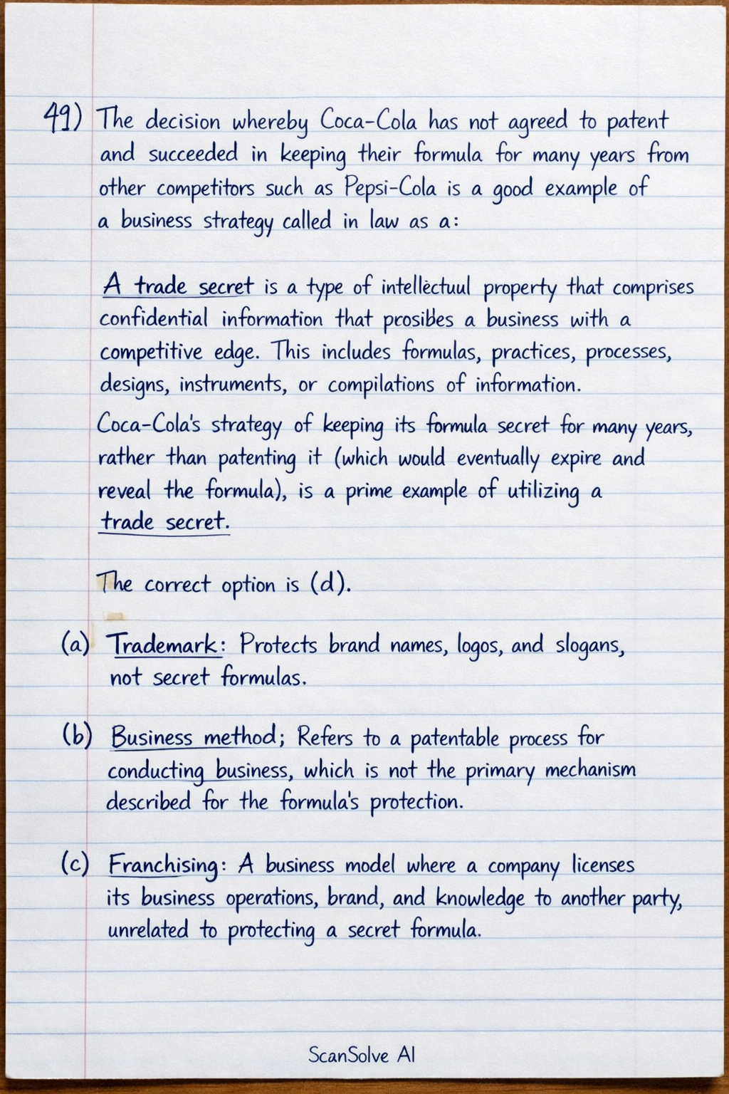 49) The decision whereby Coca-Cola has not agreed to patent and succeeded in keeping their formula for many years from other competitors such as Pepsi-Cola is a good example of a business strategy called in law as a:
