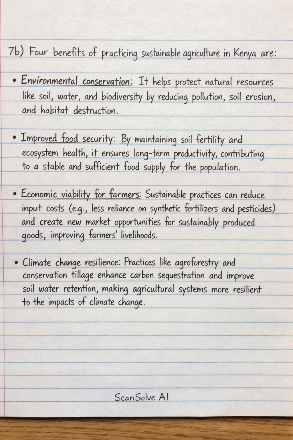 7b) Four benefits of practicing sustainable agriculture in Kenya are: • Environmental conservation: It helps protect natural resources like soil, water, and biodiversity by reducing pollution, soil erosion, and habitat destruction. • Improved food security: By maintaining soil fertility and ecosystem health, it ensures long-term productivity, contributing to a stable and sufficient food supply for the population. • Economic viability for farmers: Sustainable practices can reduce input costs (e.g., less reliance on synthetic fertilizers and pesticides) and create new market opportunities for sustainably produced goods, improving farmers' livelihoods. • Climate change resilience: Practices like agroforestry and conservation tillage enhance carbon sequestration and improve soil water retention, making agricultural systems more resilient to the impacts of climate change.