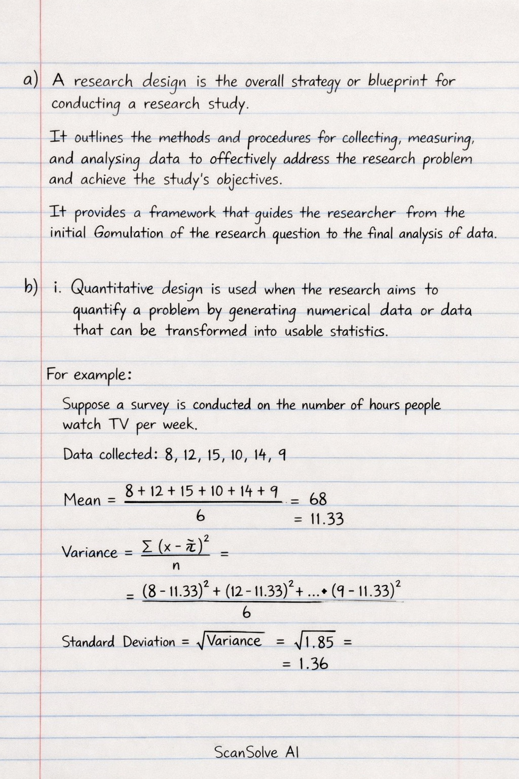 a) A research design is the overall strategy or blueprint for conducting a research study. It outlines the methods and procedures for collecting, measuring, and analyzing data to effectively address the research problem and achieve the study's objectives. It provides a framework that guides the researcher from the initial formulation of the research question to the final analysis of data.