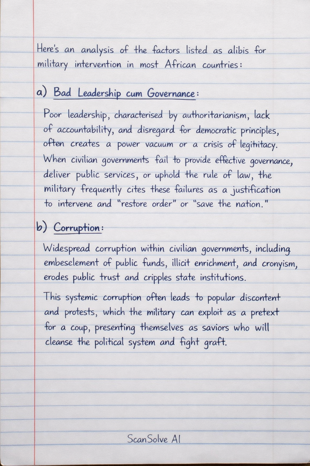 Here are explanations for the factors listed as alibis for military intervention in most African countries: