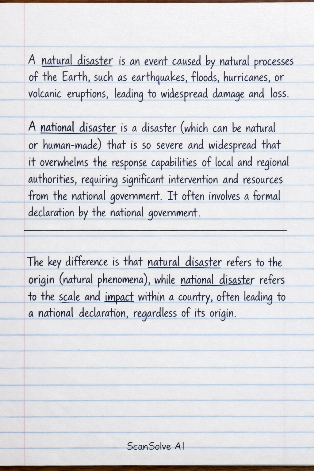 The key difference is that natural disaster refers to the origin (natural phenomena), while national disaster refers to the scale and impact within a country, often leading to a national declaration, regardless of its origin.