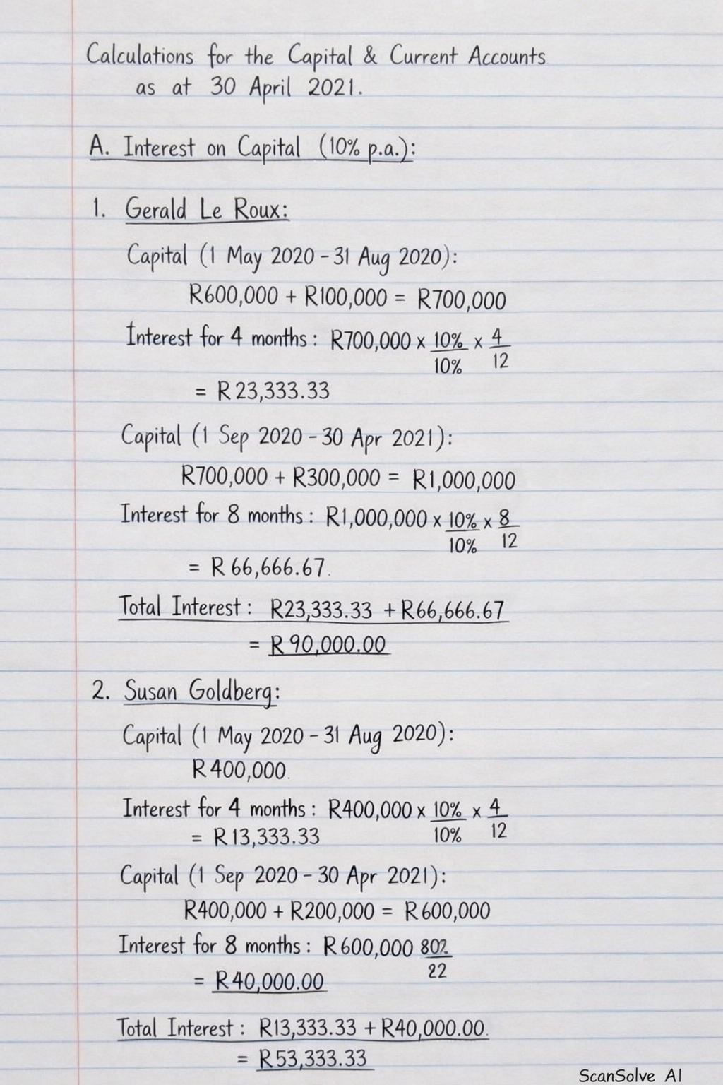 Here are the calculations for the capital and current accounts of the partners as at 30 April 2021.