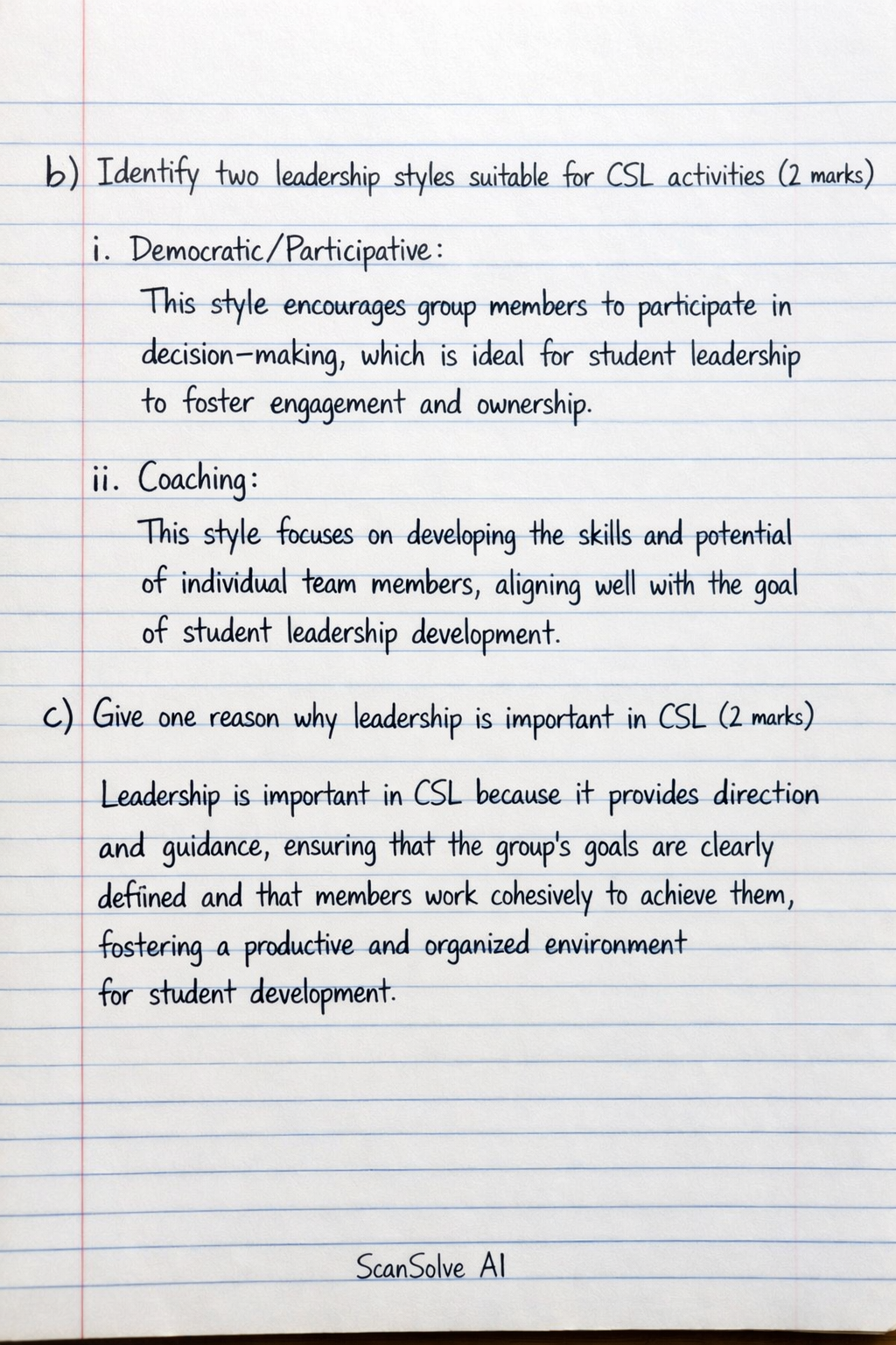 c) Give one reason why leadership is important in CSL (2 marks) Leadership is important in CSL because it provides direction and guidance, ensuring that the group's goals are clearly defined and that members work cohesively to achieve them, fostering a productive and organized environment for student development.