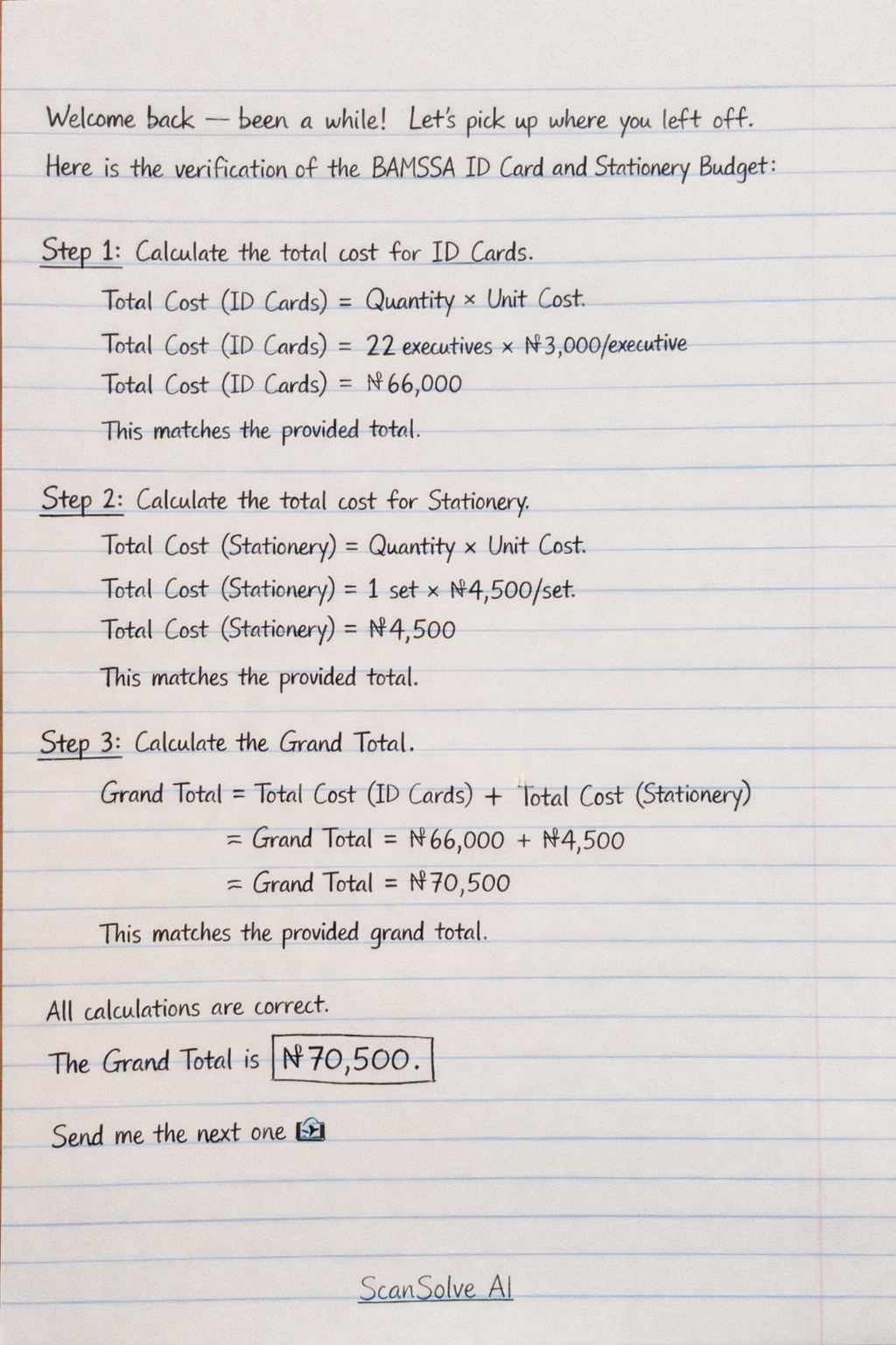 Welcome back — been a while! Let's pick up where you left off. Here is the verification of the BAMSSA ID Card and Stationery Budget: Step 1: Calculate the total cost for ID Cards.