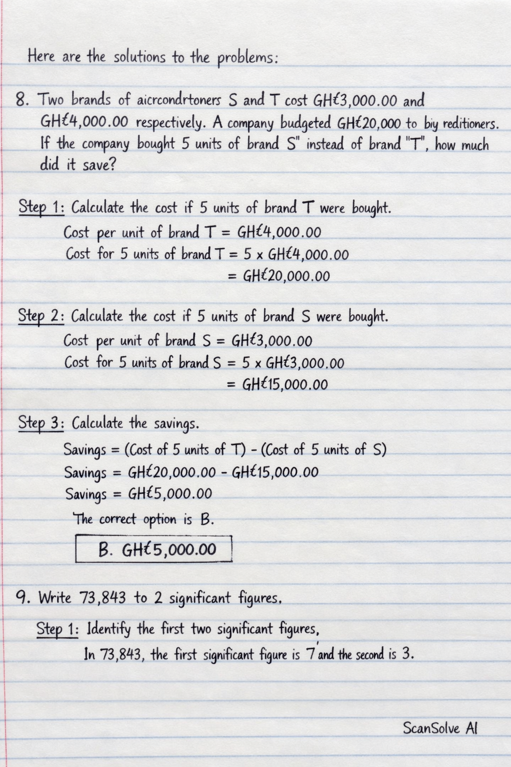 8. Two brands of airconditions S and T cost GH¢3,000.00 and GH¢4,000.00 respectively. A company budgeted GH¢20,000.00 to buy air conditioners. If the company bought 5 units of brand 'S' instead of brand 'T', how much did it save?