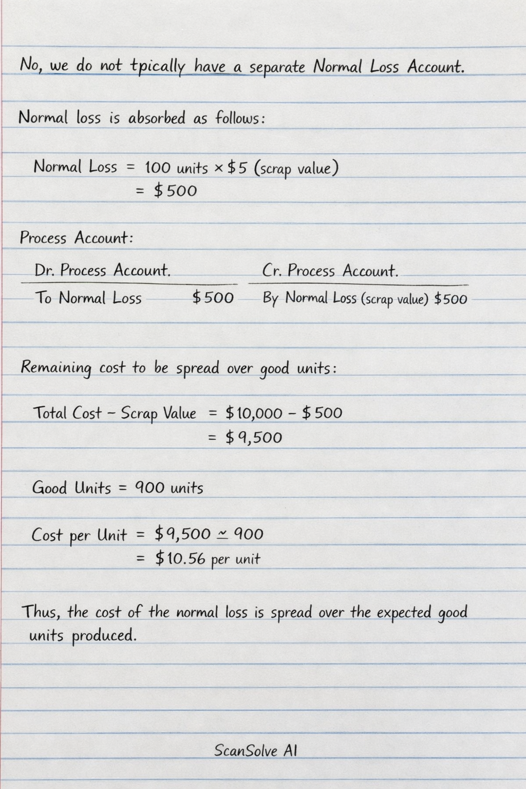 Normal loss is an inherent part of the production process, and its cost (after deducting any scrap value) is absorbed by the good units produced. In accounting, the normal loss is usually credited directly to the Process Account at its scrap value, and the remaining cost is spread over the expected output. A separate ledger account for normal loss is generally not maintained because it is considered a normal cost of production rather than an unusual event requiring a distinct account for tracking profit or loss.