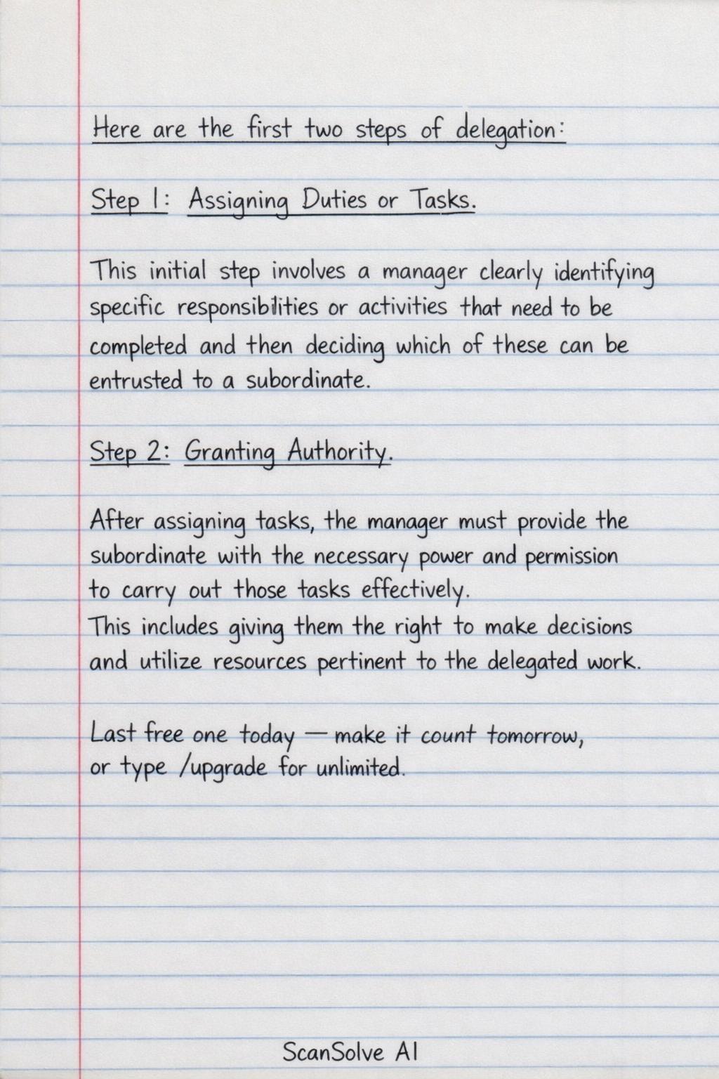 Step 2: Granting Authority. After assigning tasks, the manager must provide the subordinate with the necessary power and permission to carry out those tasks effectively. This includes giving them the right to make decisions and utilize resources pertinent to the delegated work.