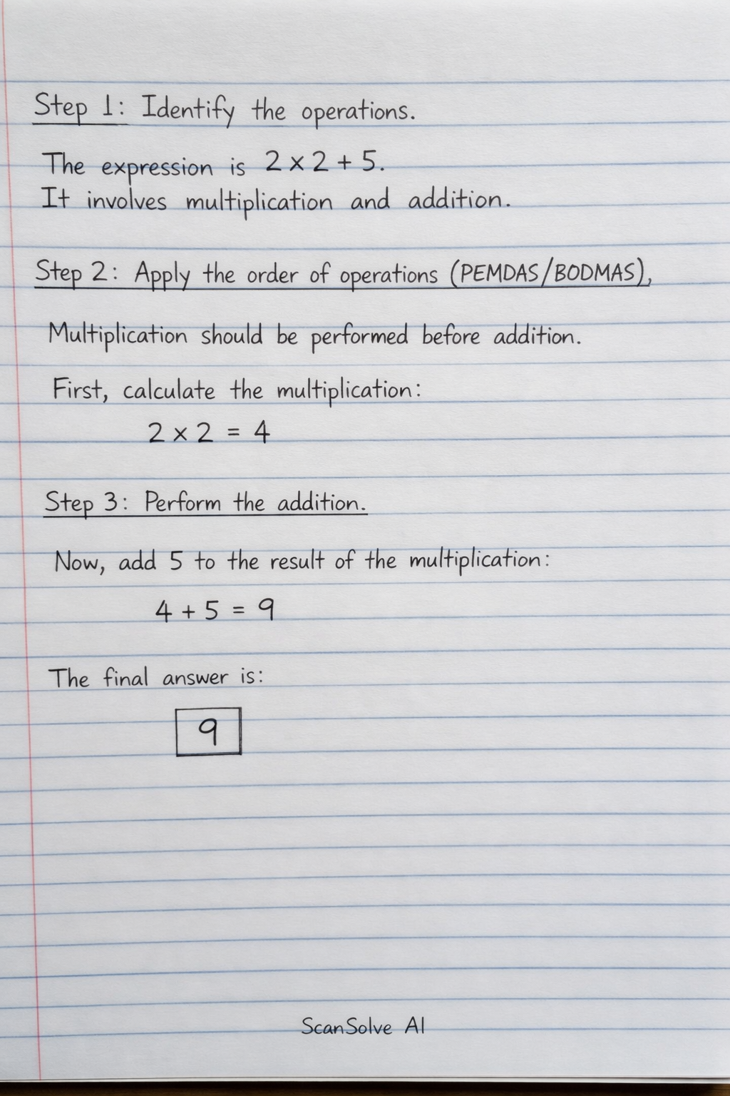 Step 1: Identify the operations. The expression is . It involves multiplication and addition.