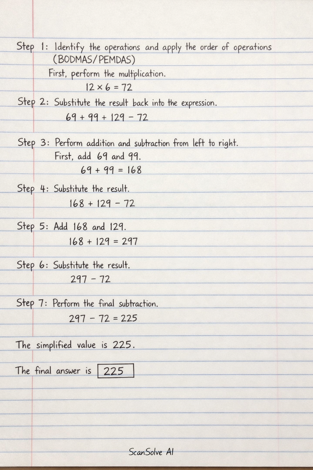 VerifiedStep 1: Identify the operations and apply the order of operations (BODMAS/PEMDAS). The expression is . First, perform the multiplication.