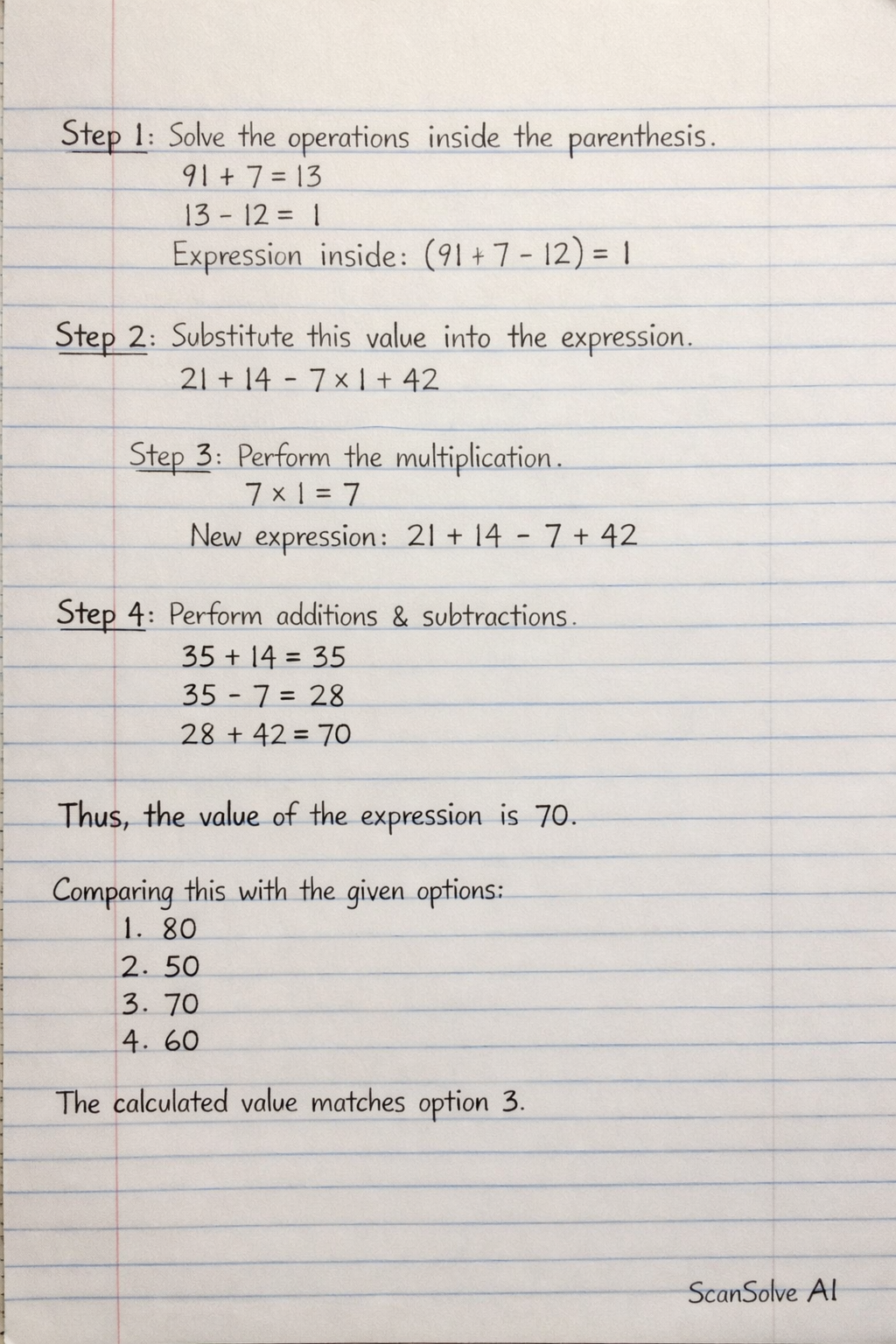 To find the value of the expression , we follow the order of operations (BODMAS/PEMDAS): Brackets, Orders (powers/roots), Division and Multiplication (from left to right), Addition and Subtraction (from left to right).