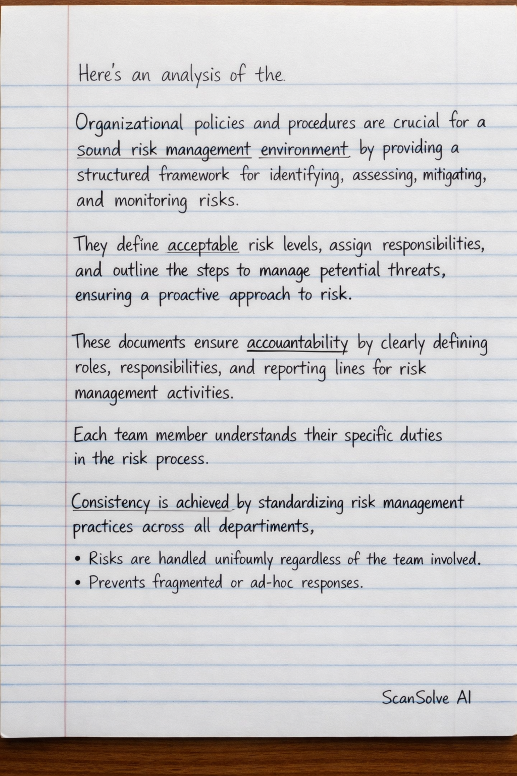 Organizational policies and procedures are crucial for a sound risk management environment by providing a structured framework for identifying, assessing, mitigating, and monitoring risks. They define acceptable risk levels, assign responsibilities, and outline the steps to manage potential threats, ensuring a proactive approach to risk.