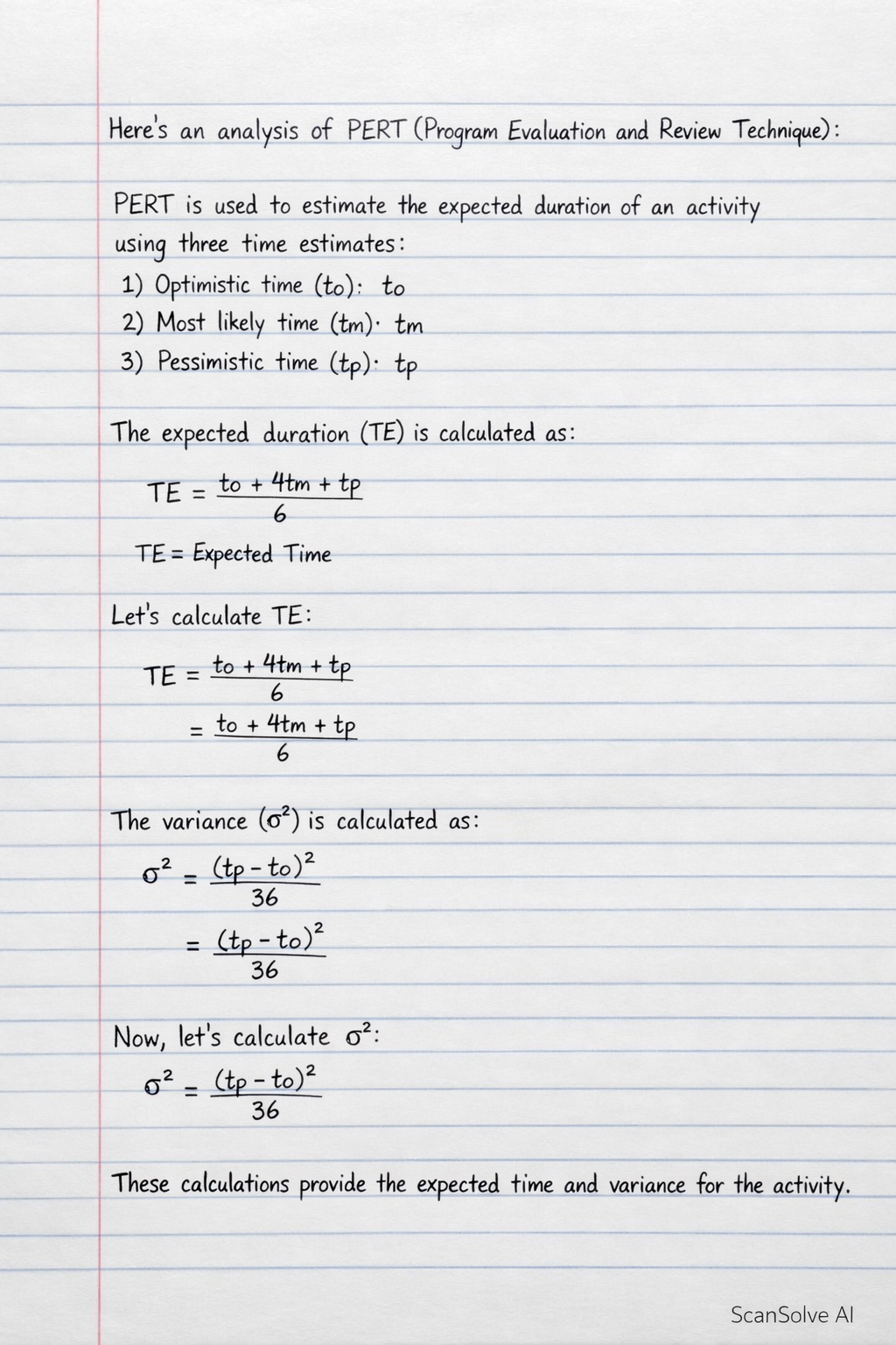PERT (Program Evaluation and Review Technique) is a project management technique used for planning, scheduling, and controlling complex projects with uncertain activity durations. It employs three time estimates for each activity: optimistic (to), most likely (tm), and pessimistic (tp), to calculate an expected activity duration and its variance. This probabilistic approach helps in estimating project completion time and assessing the probability of meeting deadlines, making it suitable for research and development projects or those with little historical data.