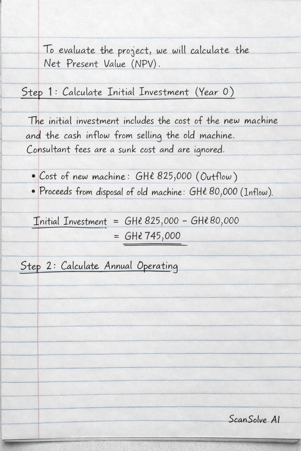To evaluate the project, we will calculate the Net Present Value (NPV). Step 1: Calculate Initial Investment (Year 0) The initial investment includes the cost of the new machine and the cash inflow from selling the old machine.
