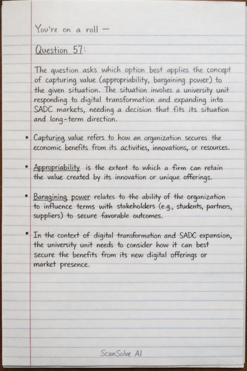 You're on a roll — Question 57: The question asks which option best applies the concept of capturing value (appropriability, bargaining power) to the given situation.