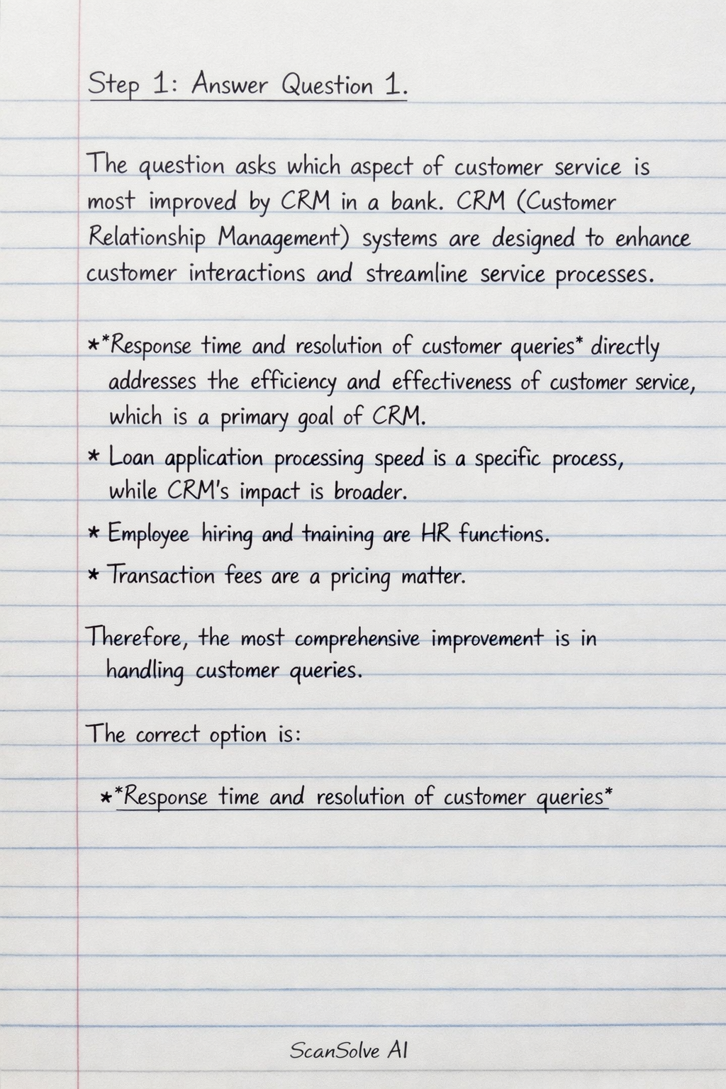 Step 1: Answer Question 1. The question asks which aspect of customer service is most improved by CRM in a bank. CRM (Customer Relationship Management) systems are designed to enhance customer interactions and streamline service processes.