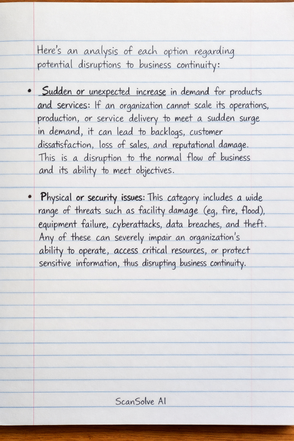 Physical or security issues: This category includes a wide range of threats such as facility damage (e.g., fire, flood), equipment failure, cyberattacks, data breaches, and theft. Any of these can severely impair an organization's ability to operate, access critical resources, or protect sensitive information, thus disrupting business continuity.