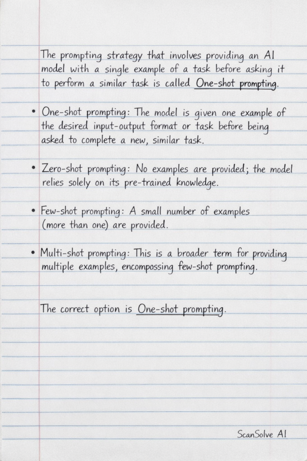 The prompting strategy that involves providing an AI model with a single example of a task before asking it to perform a similar task is called One-shot prompting.