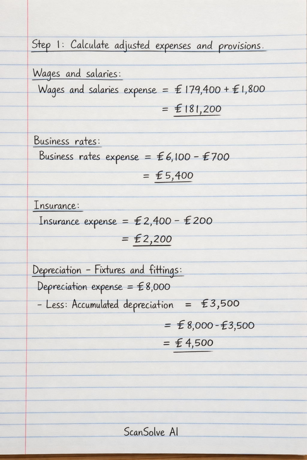 \text{Business rates expense} = \pounds6,100 - \pounds700 = \pounds5,400