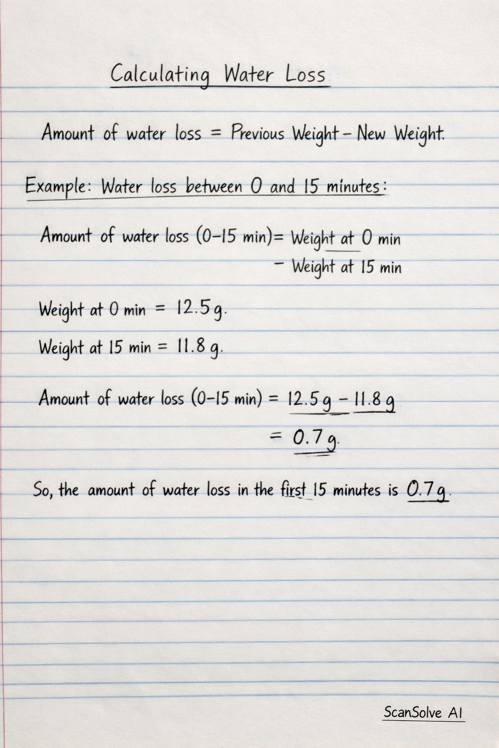 Amountofwaterloss(0−15min)=Weightat0min−Weightat15min