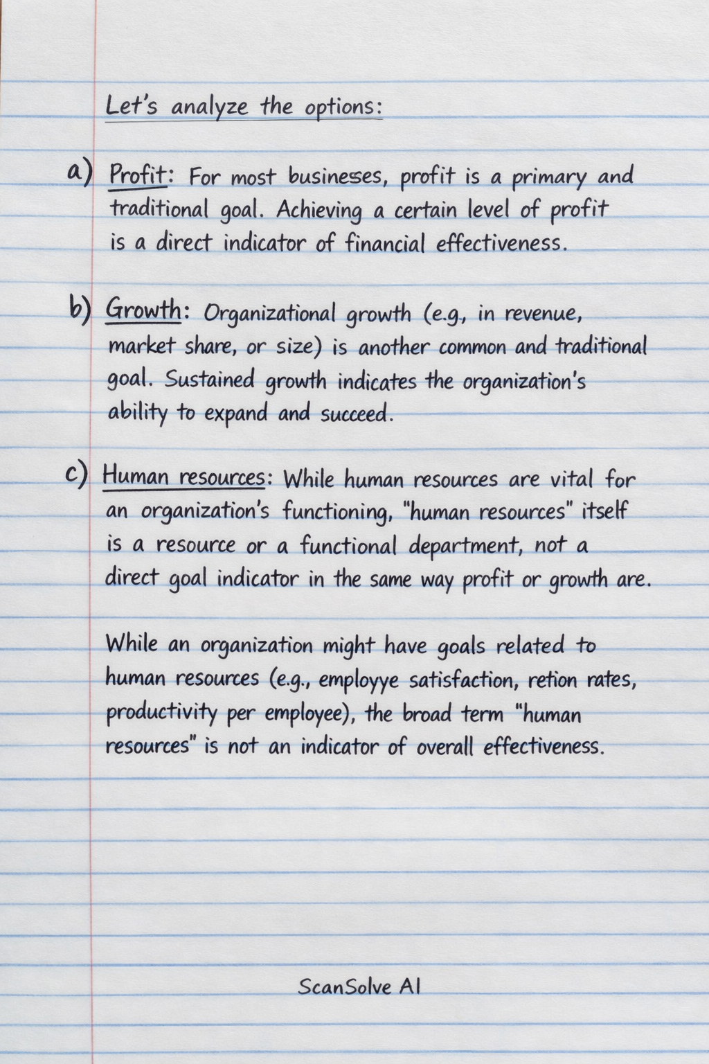 - c) Human resources: While human resources are vital for an organization's functioning, "human resources" itself is a resource or a functional department, not a direct goal indicator in the same way profit or growth are. While an organization might have goals related to human resources (e.g., employee satisfaction, retention rates, productivity per employee), the broad term "human resources" is not an indicator of overall effectiveness.