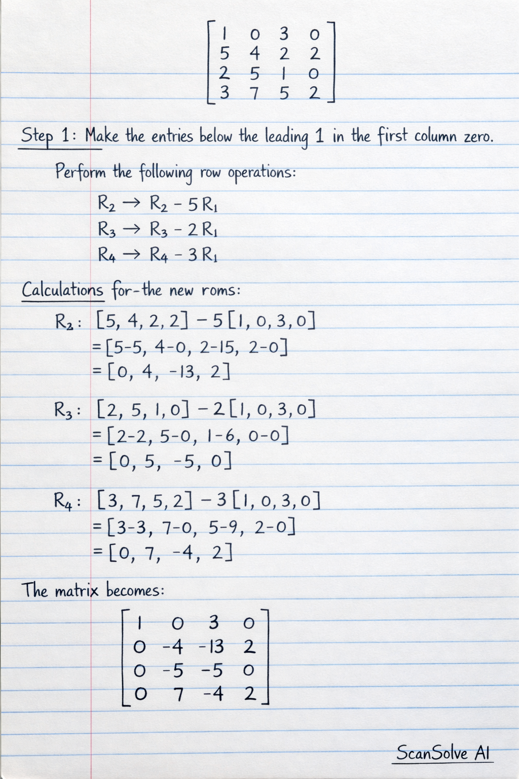 R2: [5,4,2,2]−5[1,0,3,0]=[5−5,4−0,2−15,2−0]=[0,4,−13,2]R3: [2,5,1,0]−2[1,0,3,0]=[2−2,5−0,1−6,0−0]=[0,5,−5,0]R4: [3,7,5,2]−3[1,0,3,0]=[3−3,7−0,5−9,2−0]=[0,7,−4,2]