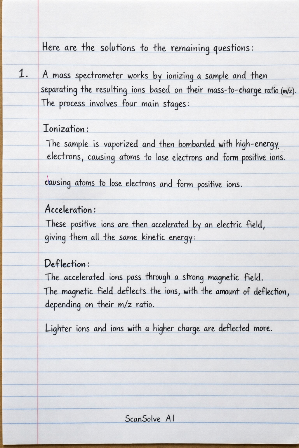• Deflection: The accelerated ions pass through a strong magnetic field. The magnetic field deflects the ions, with the amount of deflection depending on their m/z ratio. Lighter ions and ions with a higher charge are deflected more.