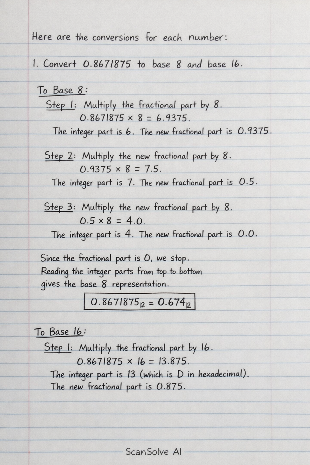 1. Convert 0.8671875 to base 8 and base 16.