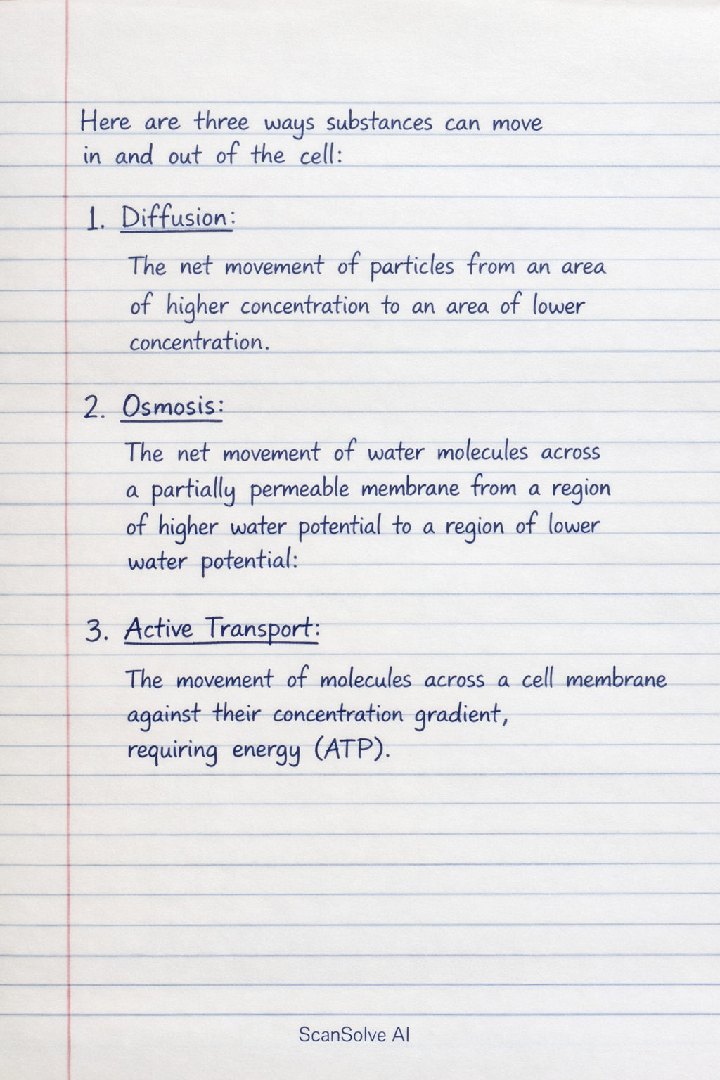 2. Osmosis: The net movement of water molecules across a partially permeable membrane from a region of higher water potential to a region of lower water potential.