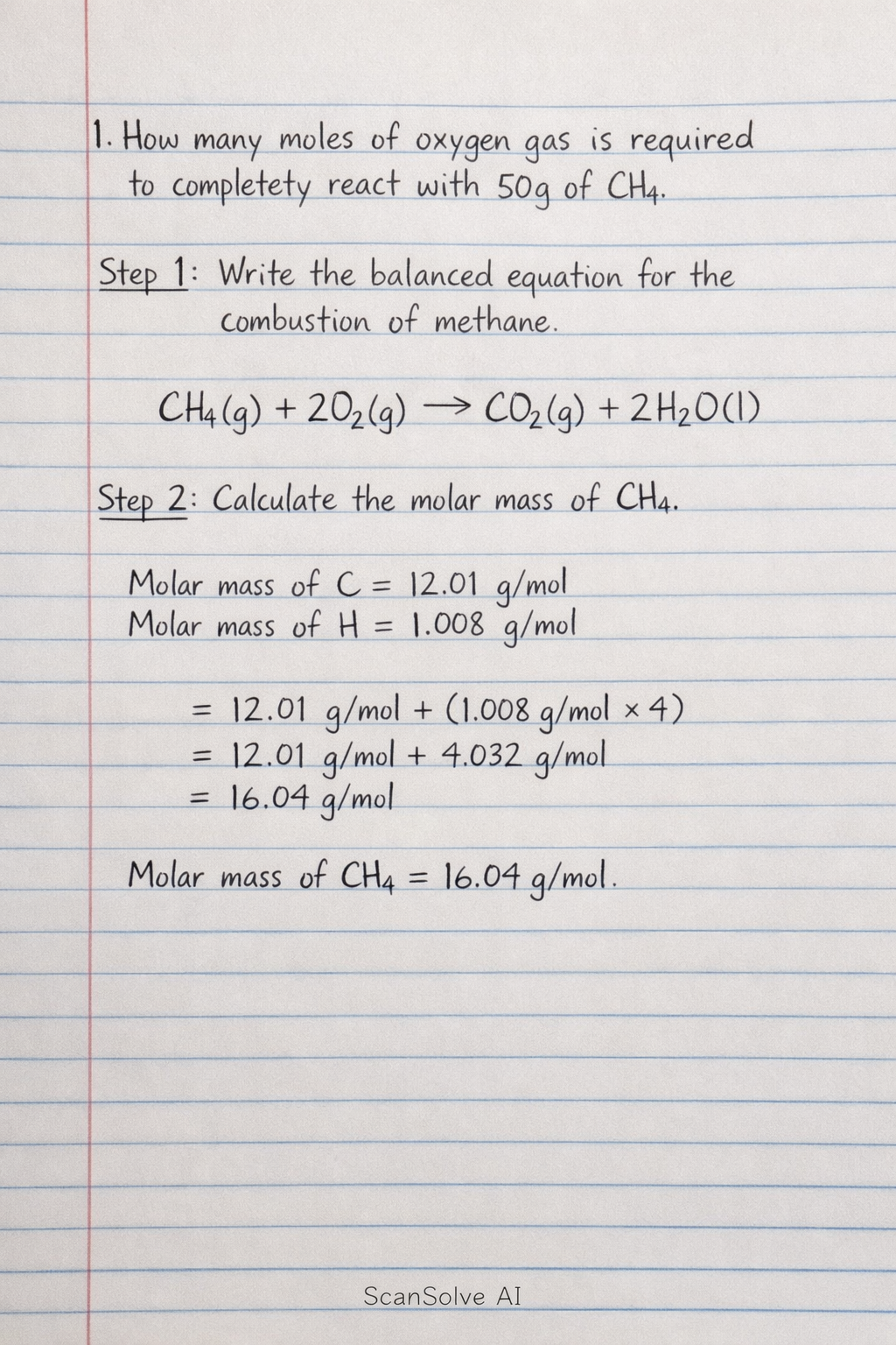 1. How many moles of oxygen gas is required to completely react with 50g of CH4