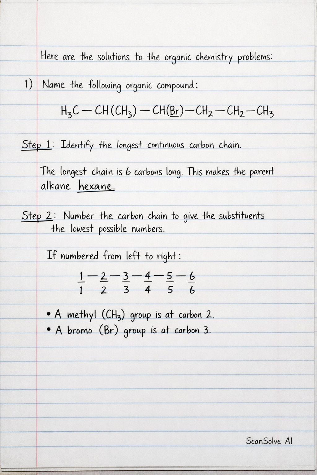 Step 2: Number the carbon chain to give the substituents the lowest possible numbers. If numbered from left to right: • A methyl () group is at carbon 2. • A bromo () group is at carbon 3.