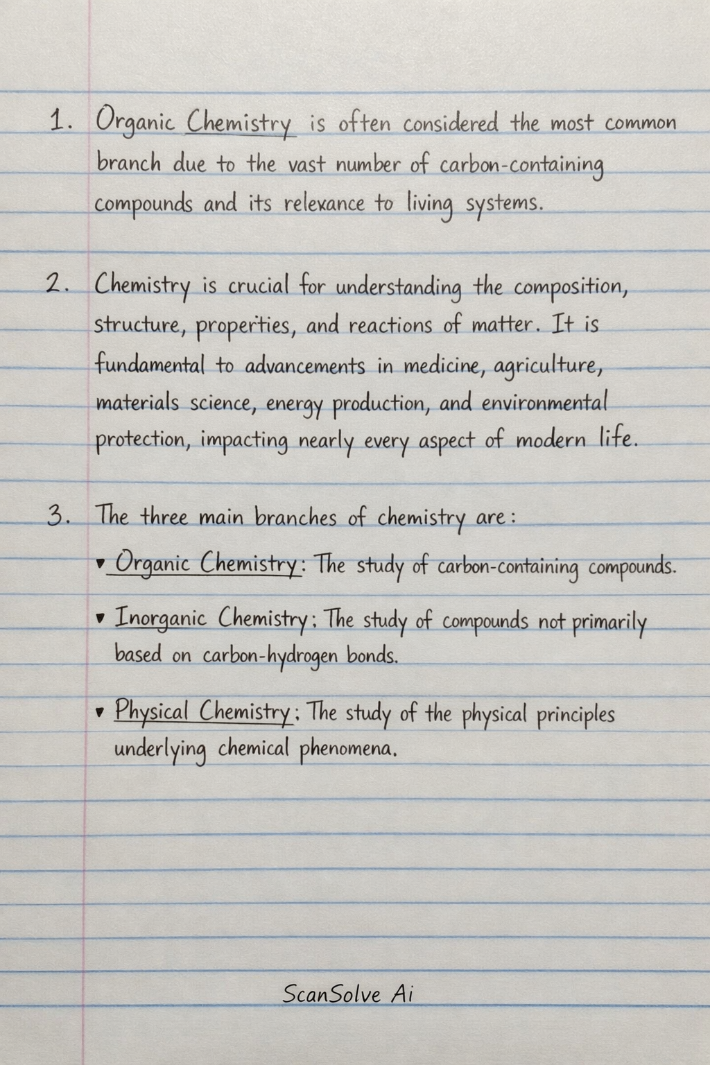 1. Organic Chemistry is often considered the most common branch due to the vast number of carbon-containing compounds and its relevance to living systems.