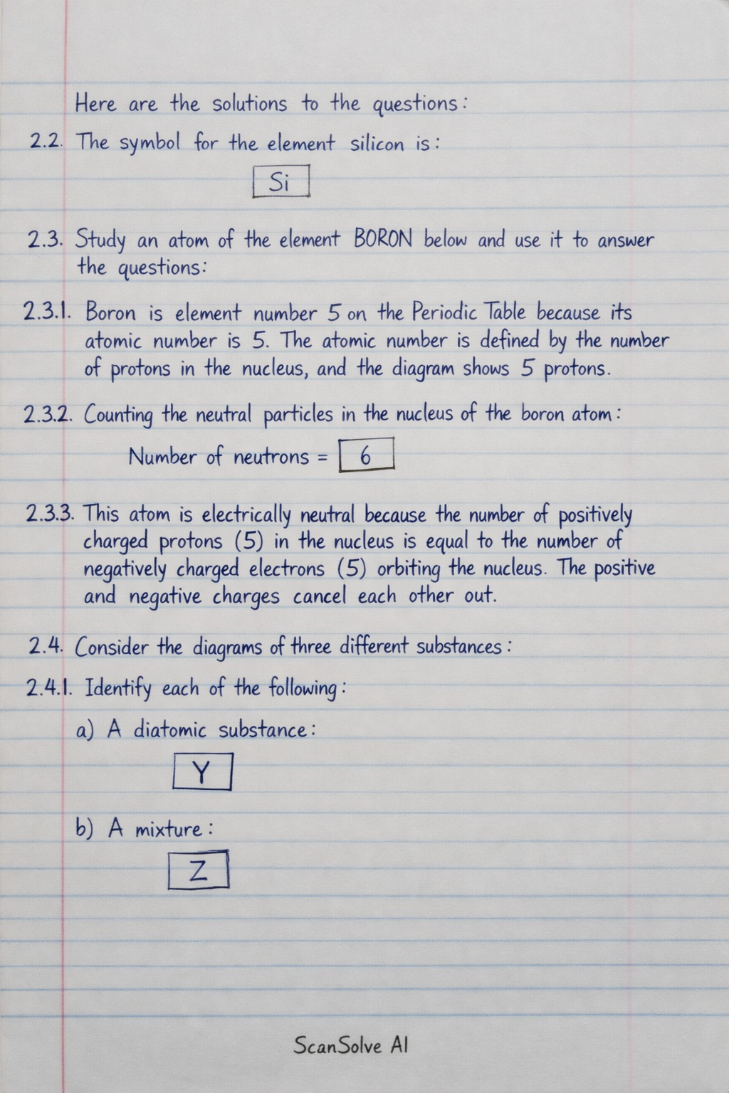 2.3.3 This atom is electrically neutral because the number of positively charged protons (5) in the nucleus is equal to the number of negatively charged electrons (5) orbiting the nucleus. The positive and negative charges cancel each other out.